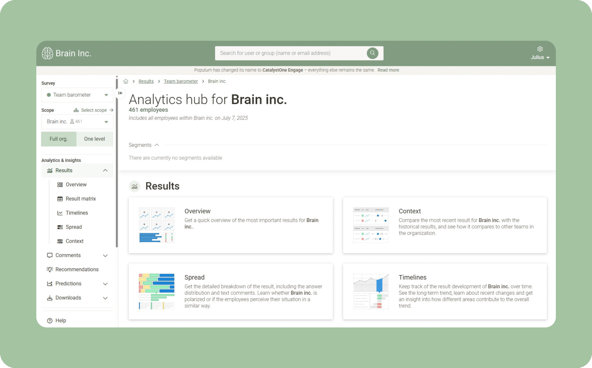 CatalystOne offers a cloud-based HR software suite built to streamline processes for medium and large organisations across the Nordics. It transforms HR from manual admin to a modern, strategic function. The suite includes two standalone products: CatalystOne HCM and CatalystOne Engage. CatalystOne HCM is a modular platform designed to fit any system landscape, connecting master data to a wide selection of modules and integrations. We work closely with our customers to build an HR setup that includes only what they need, whether that’s employee data analytics, absence, learning management, continuous performance, compensation, payroll, time, recruitment, or most other HR tasks. Engage is the latest addition to the CatalystOne suite. It offers pulse surveys and AI-powered insights to help our customers understand and support their people better.